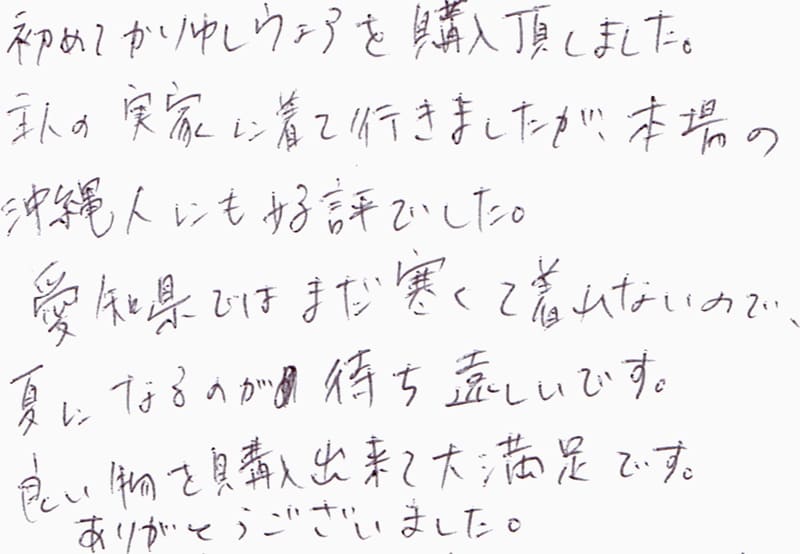 初めてかりゆしウェアを購入頂しました。主人の実家に着て行きましたが、本場の沖縄人にも好評でした。愛知県ではまだ寒くて着れないので、夏になるのが待ち遠しいです。良い物を購入出来て大満足です。ありがとうございました。