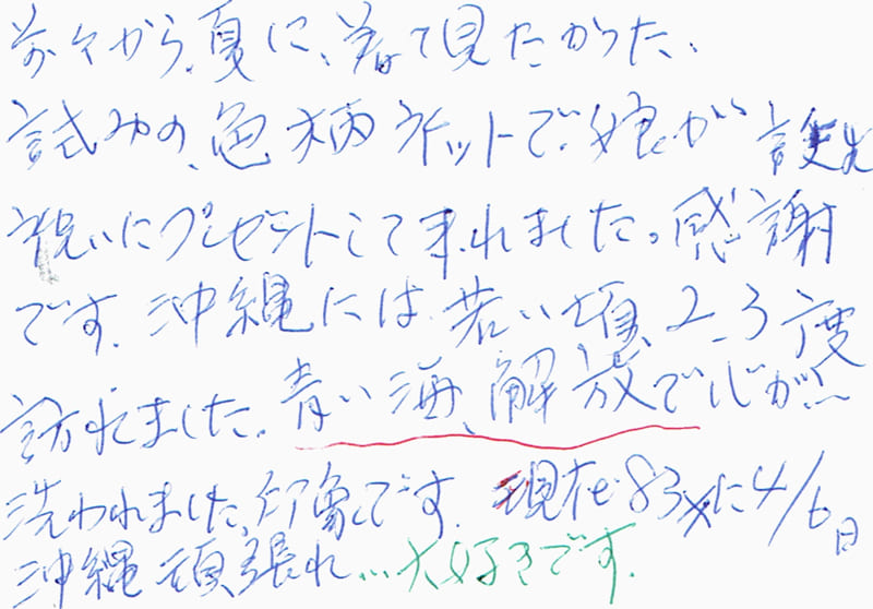前々から、夏に着て見たかった。試みの、色柄ネットで、娘が誕生祝いにプレゼントして来れました。感謝です。沖縄には、若い頃2.3度訪れました。青い海、解放で心が洗われました。印象です。現在83才に4/6日沖縄頑張れ…だいすきです。