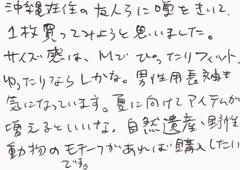沖縄在住の友人らに噂をきいて、1枚買ってみようと思いました。サイズ感は、Mでぴったりフィット。ゆったりならLかな。男性用長袖も気になっています。夏に向けてアイテムが増えるといいな。自然遺産、野生動物のモチーフがあれば購入したいです。