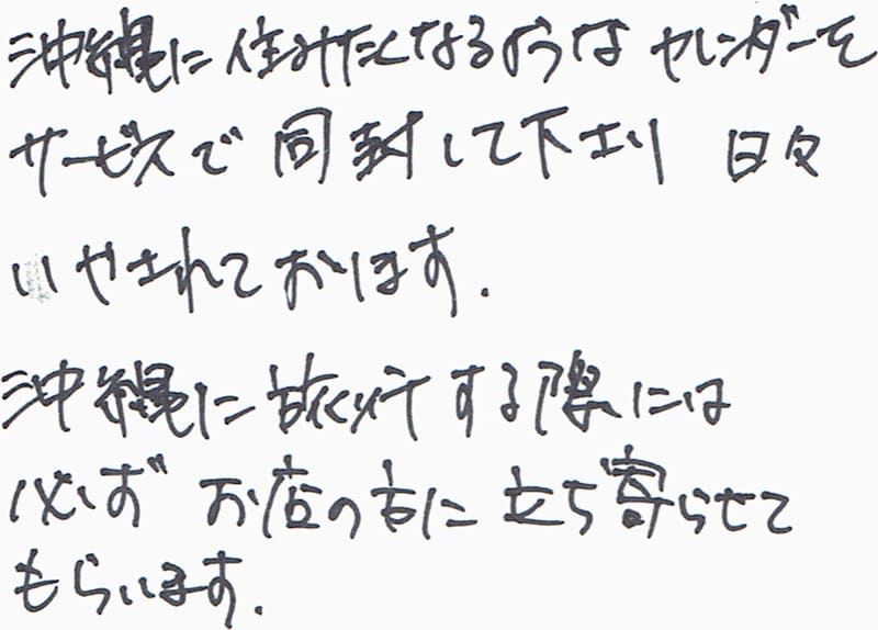 沖縄に住みたくなるようなカレンダーをサービスで同封して下さり日々いやされております。沖縄に旅行する際には必ずお店の方に立ち寄らせてもらいます。