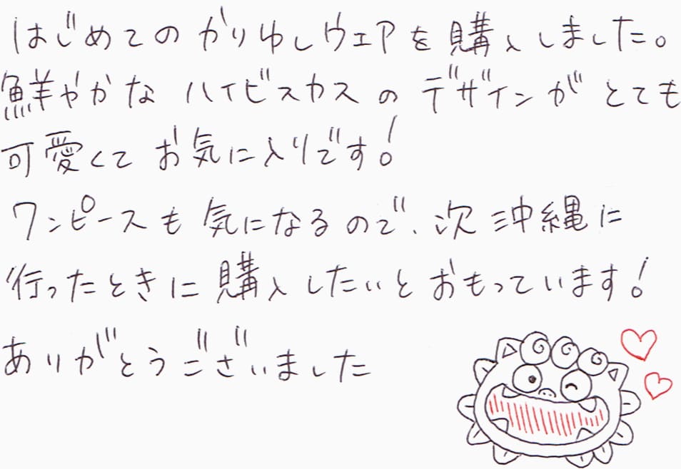 はじめてのかりゆしウェアを購入しました。鮮やかなハイビスカスのデザインがとても可愛くてお気に入りです!ワンピースも気になるので、次沖縄に行ったときに購入したいとおもっています!ありがとうございました。