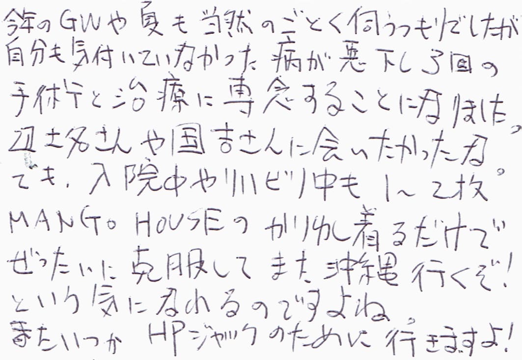 今年のGWや夏も当然のごとく伺うつもりでしたが、自分も気付いていなかった病が悪化し3回の手術と治療に専念することになりました。辺土名さんや国吉さんに会いたかったな。でも、入院中やリハビリ中も1~2枚MANGO HOUSEのかりゆし着るだけでぜったいに克服してまた沖縄に行くぞ!という気になれるのですよね。またいつかHPジャックのために行きますよ!