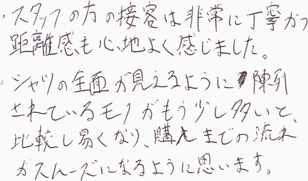 ・シャツの全面が見えるように陳列されているモノがもう少し多いと、比較し易くなり、購入までの流れがスムーズになるように思います。