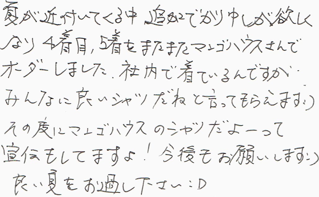 夏が近付いてくる中追加でかりゆしが欲しくなり4着目、5着をまたまたマンゴハウスさんでオーダーしました。社内で着ているんですが、みんなに良いシャツだねと言ってもらえます。その度にマンゴハウスのシャツだよーって宣伝もしてますよ!今後もお願いします。良い夏をお過ごし下さい。