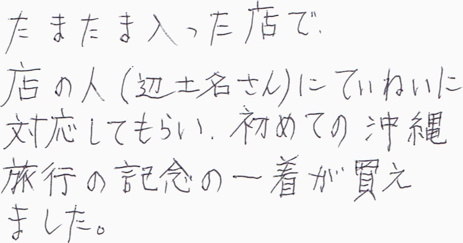 たまたま入った店で、店の人(辺土名さん)にていねいに対応してもらい、初めての沖縄旅行の記念の一着が買えました。