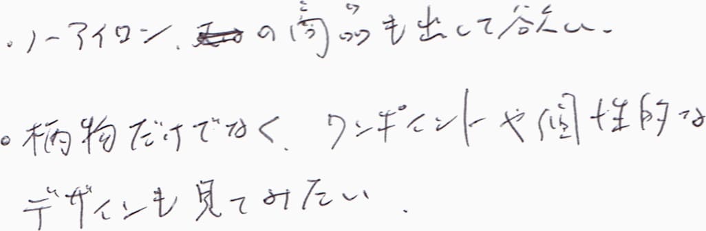 - 柄物だけでなく、ワンポイントや個性的なデザインも見てみたい。