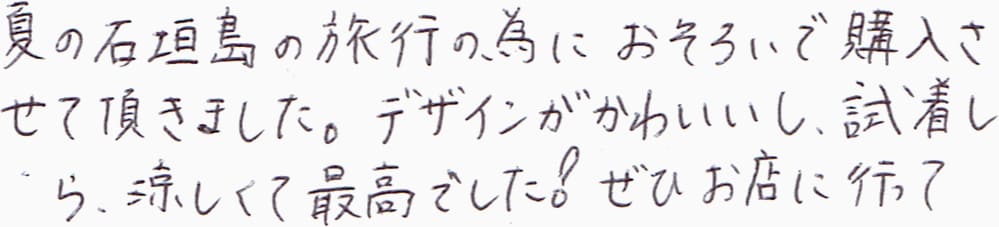 夏の石垣島の旅行の為におそろいで購入させて頂きました。デザインがかわいいし、試着したら、涼しくて最高でした!ぜひお店に行ってみたいです!