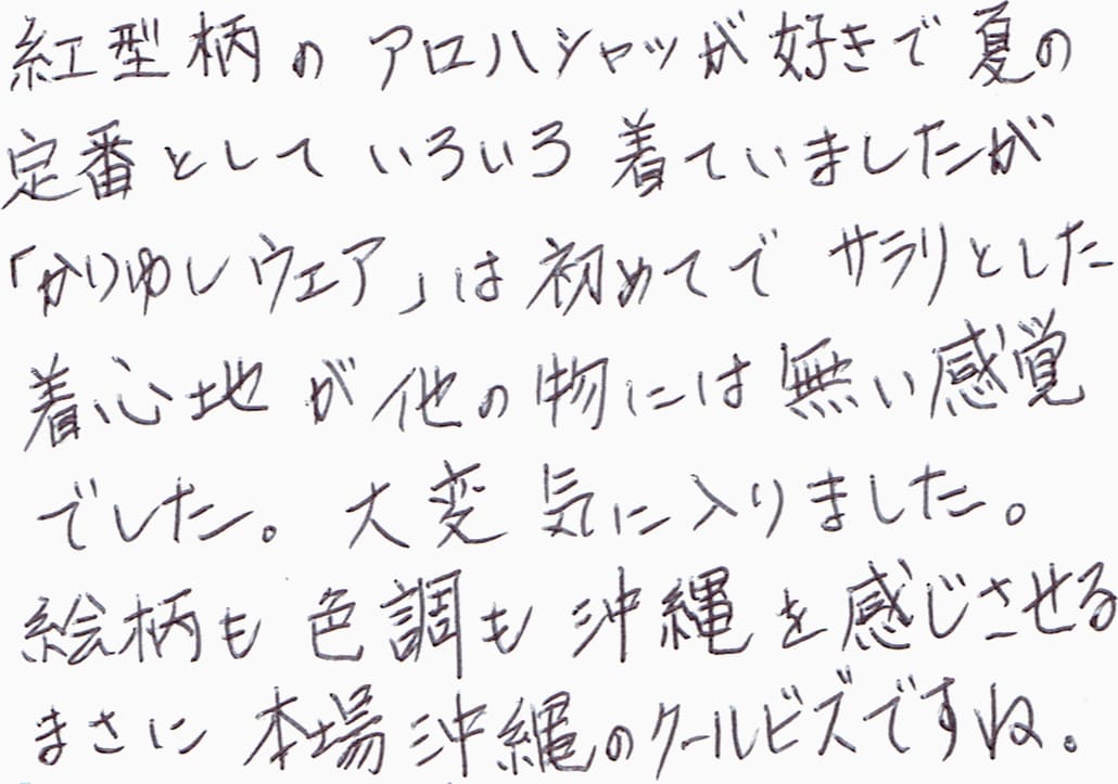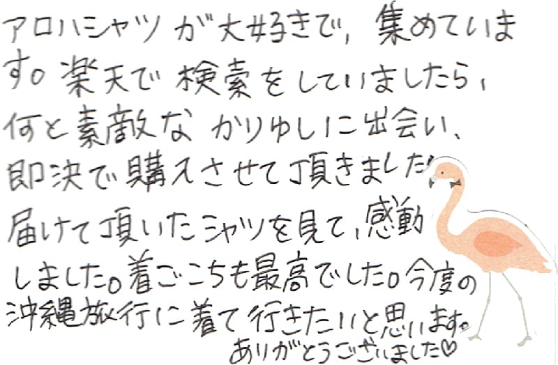 アロハシャツが大好きで、集めています。楽天で検索をしていましたら、何と素敵なかりゆしに出会い、即決で購入させて頂きました!届けて頂いたシャツを見て、感動しました。着ごこちも最高でした。今度の沖縄旅行に着て行きたいと思います。ありがとうございました。