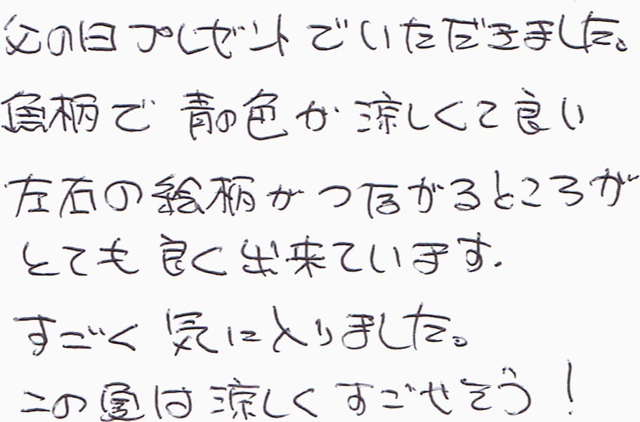 父の日プレゼントでいただきました。魚柄で青の色が涼しくて良い左右の絵柄がつながるところがとても良く出来ています。すごく気に入りました。この夏は涼しくすごせそう!