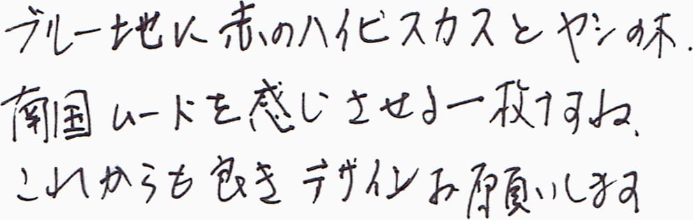 ブルー地に赤のハイビスカスとヤシの木。南国ムードを感じさせる一枚ですね。これからも良きデザインお願いします。