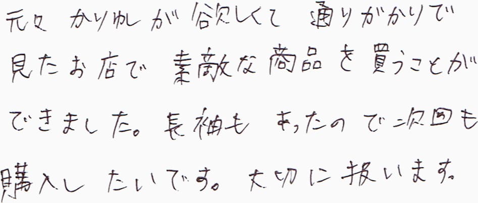- 元々かりゆしが欲しくて通りがかりで見たお店で素敵な商品を買うことができました。