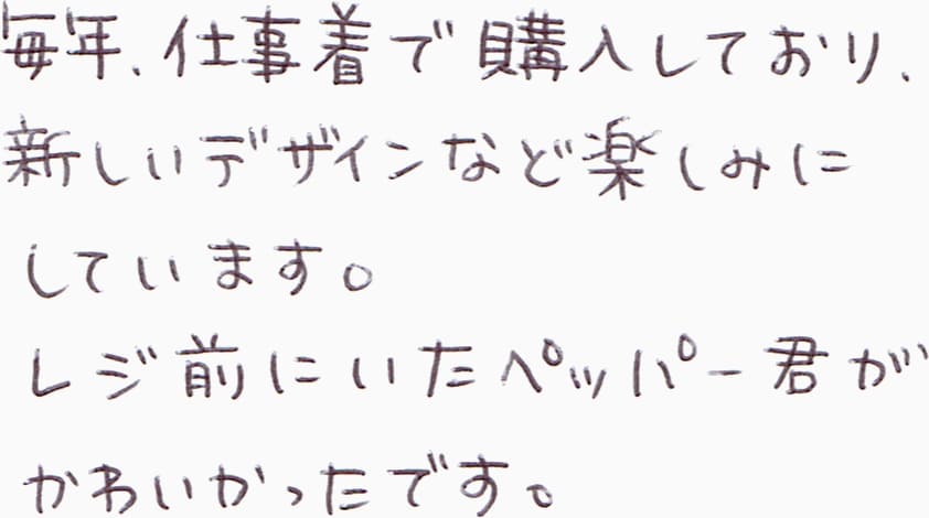 毎年、仕事着で購入しており、新しいデザインなど楽しみにしています。レジ前にいたペッパー君がかわいかったです。