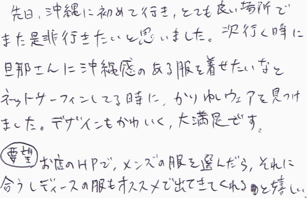 先日、沖縄に初めて行き、とても良い場所でまた是非行きたいと思いました。次行く時に旦那さんに沖縄感のある服を着せたいなとネットサーフィンしてる時に、かりゆしウェアを見つけました。デザインもかわいく、大満足です。要望 お店のHPで、メンズの服を選んだら、それに合うレディースの服もオススメで出てきてくれると嬉しい。