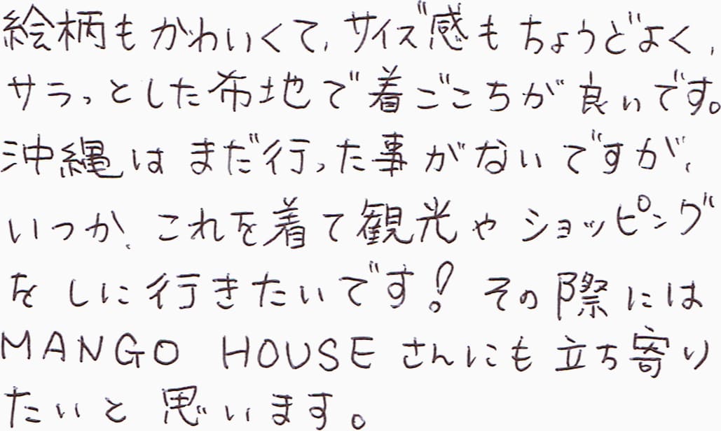 絵柄もかわいくて、サイズ感もちょうどよく、サラッとした布地で着ごこちが良いです。沖縄はまだ行った事がないですが、いつか、これを着て観光やショッピングをしに行きたいです!その際にはMANGO HOUSEさんにも立ち寄りたいと思います。