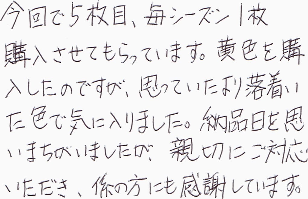 今回で5枚目、毎シーズン1枚購入させてもらっています。黄色を購入したのですが、思っていたより落着いた色で気に入りました。納品日を思いまちがいましたが、親切にご対応いただき、係の方にも感謝しています。