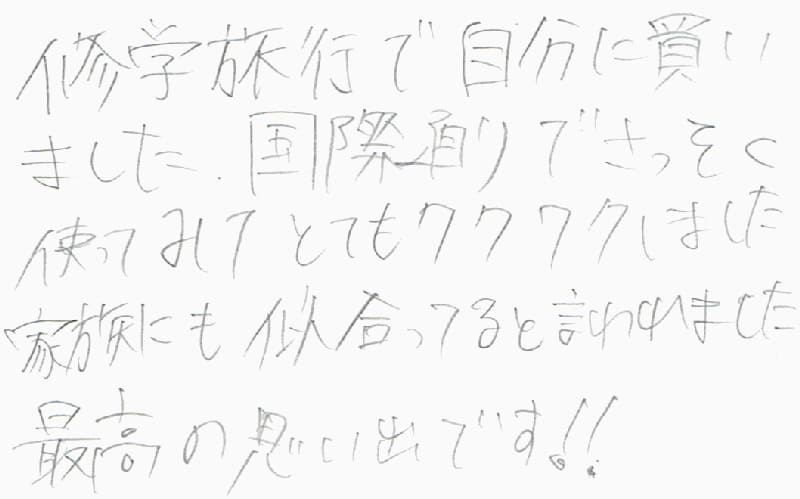 修学旅行で自分に買いました。国際通りでさっそく使ってみてとてもワクワクしました。家族にも似合ってると言われました。最高の思い出です!!