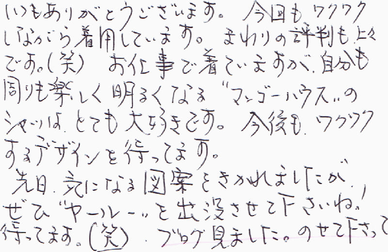 いつもありがとうございます。今回もワクワクしながら着用しています。まわりの評判も上々です。(笑) お仕事で着ていますが、自分も周りも楽しく明るくなる”マンゴーハウス”のシャツは、とても大好きです。今後も、ワクワクするデザインを待ってます。先日、気になる図案をきかれましたが、ぜひ”ヤールー”を出没させて下さいね!待ってます。(笑)ブログ見ました。のせて下さってありがとう!