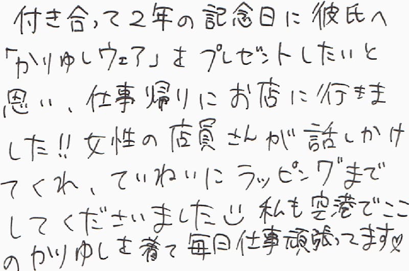 付き合って2年の記念日に彼氏へ「かりゆしウェア」をプレゼントしたいと思い、仕事帰りにお店に行きました!!女性の店員さんが話しかけてくれ、ていねいにラッピングまでしてくださいました。私も空港でここのかりゆしを着て毎日仕事頑張ってます。
