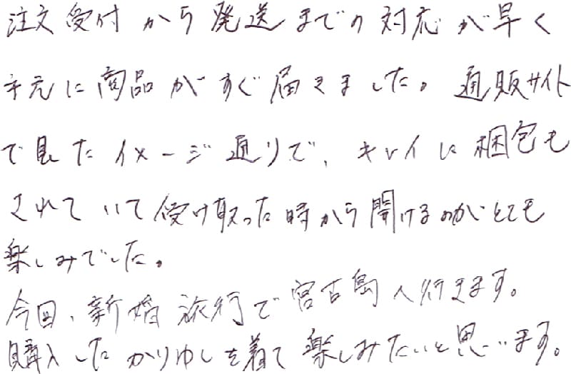 注文受付から発送までの対応が早く手元に商品がすぐ届きました。通販サイトで見たイメージ通りで、キレイに梱包もされていて受け取った時から開けるのがとても楽しみでした。今回、新婚旅行で宮古島へ行きます。購入したかりゆしを着て楽しみたいと思います。