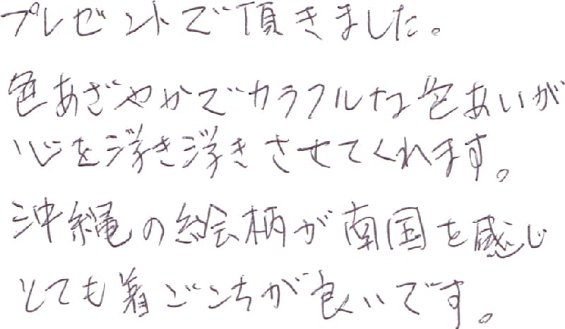 プレゼントで頂きました。色あざやかでカラフルな色あいが心を浮き浮きさせてくれます。沖縄の絵柄が南国を感じとても着ごこちが良いです。
