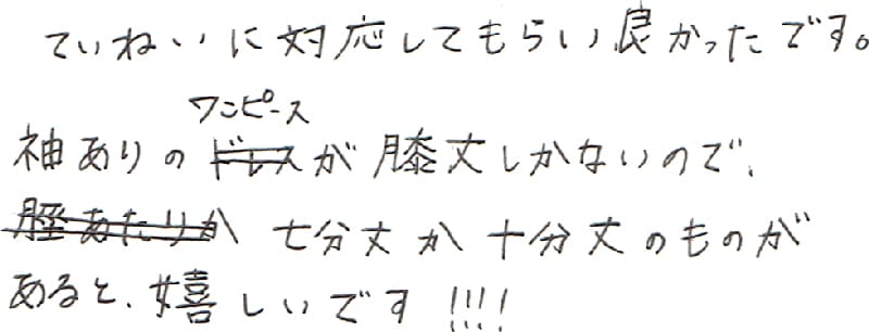 - 袖ありのワンピースが膝丈しかないので、七分丈か十分丈のものがあると、嬉しいです!!!!