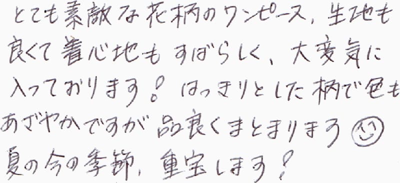 とても素敵な花柄のワンピース、生地も良くて着心地もすばらしく、大変気に入っております!はっきりとした柄で色もあざやかですが品良くまとまります。夏の今の季節、重宝します!