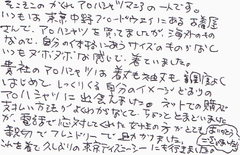そこそこのかくれアロハシャツマニアの一人です。いつもは東京中野ブロードウェイにある古着屋さんで、アロハシャツを買ってましたが、海外のものなので、自分の体格にあうサイズのものがなくいつもズボズボな感じで、着ていました。貴社のアロハシャツは着丈も袖丈も、調度よくはじめてしっくりくる自分のイメージどおりのアロハシャツに出会えました。ネットでの購入で支払い方法がよくわからなくて、ちょっととまどいました。が、電話で対応してくれた女性の方がとても親切でフレンドリーで助かりました。これを着て久しぶりの東京ディズニーシーにも行きました。