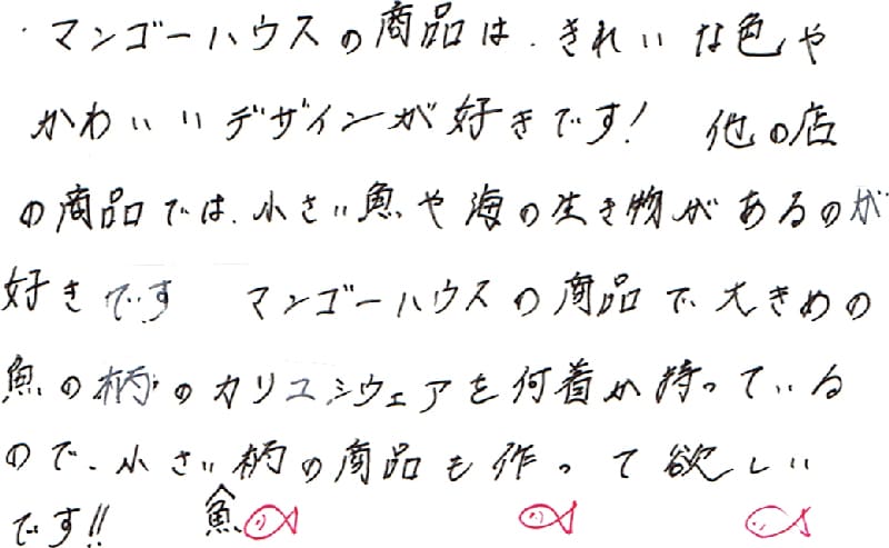 ・マンゴハウスの商品は、きれいな色やかわいいデザインが好きです!他の店の商品では、小さい魚や海の生き物があるのが好きです。マンゴーハウスの商品で大きめの魚の柄のカリユシウェアを何着か持っているので、小さい柄の商品も作って欲しいです!!