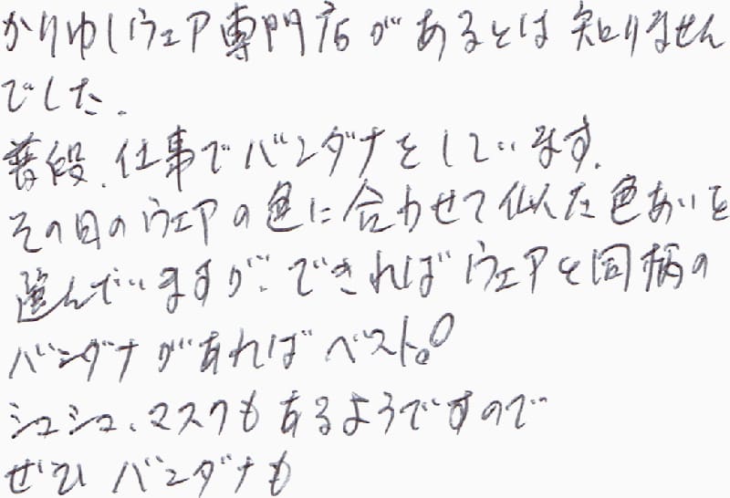 かりゆしウェア専門店があるとは知りませんでした。普段、仕事でバンダナをしています。その日のウェアの色に合わせて似た色あいを選んでいますが、できればウェアと同柄のバンダナがあればベスト!シュシュ、マスクもあるようですのでぜひバンダナも
