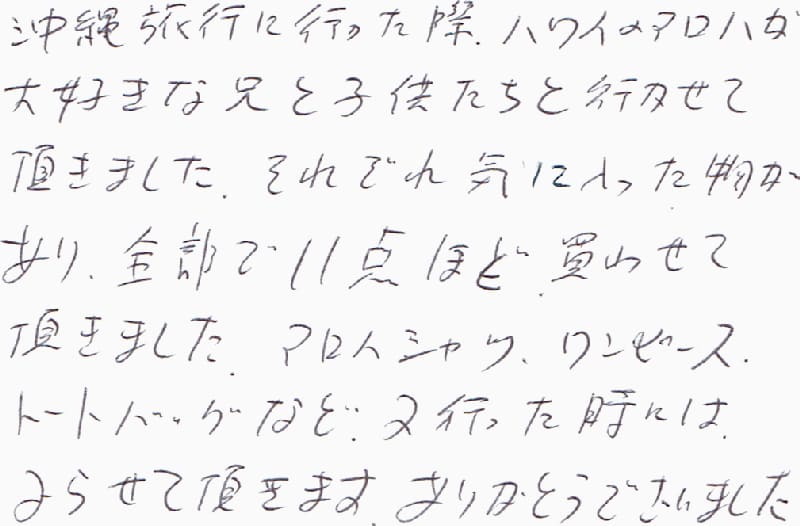 沖縄旅行に行った際、ハワイのアロハが大好きな兄と子供たちと行かせて頂きました。それぞれ気に入った物があり、全部で11点ほど買わせて頂きました。アロハシャツ、ワンピース、トートバックなど、又行った時には、よらせて頂きます。ありがとうございました。