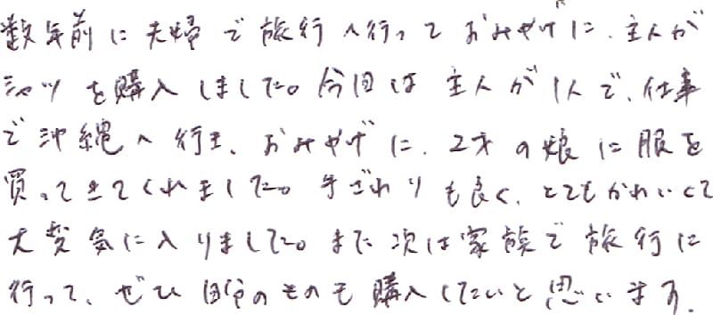 数年前に夫婦で旅行へ行っておみやげに、主人がシャツを購入しました。今回は主人が1人で、仕事で沖縄へ行き、おみやげに、2才の娘に服を買ってきてくれました。手ざわりも良く、とてもかわいくて大変気に入りました。また次は家族で旅行に行って、ぜひ自分のものも購入したいと思います。