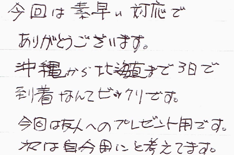 今回は素早い対応でありがとうございます。沖縄から北海道まで3日で到着なんてビックリです。今回は友人へのプレゼント用です。次は、自分用にと考えてます。