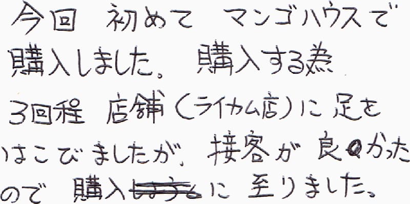 今回初めてマンゴハウスで購入しました。購入する為、3回程店舗(ライカム店)に足をはこびましたが、接客が良かったので購入に至りました。