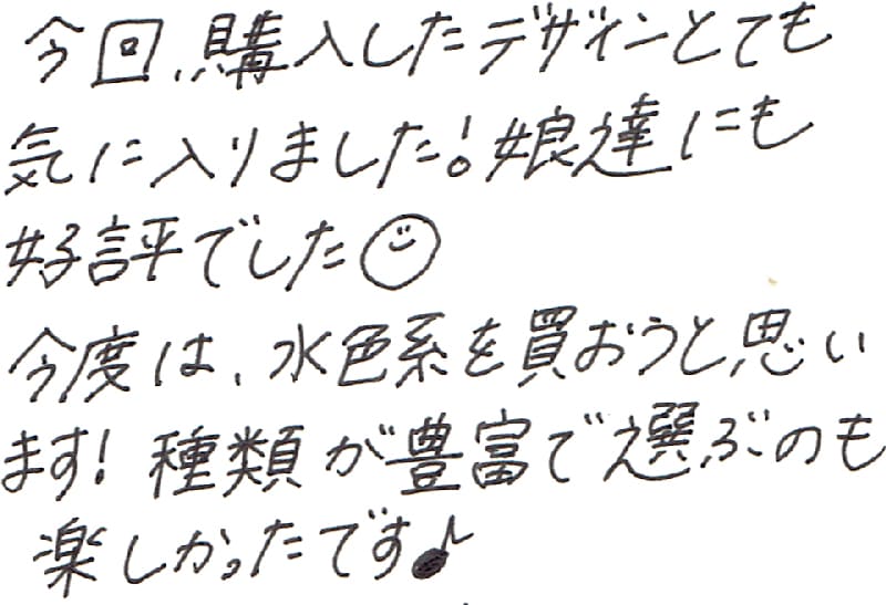 今回、購入したデザインとても気に入りました!娘達にも好評でした。今度は、水色系を買おうと思います!種類が豊富で選ぶのも楽しかったです♪