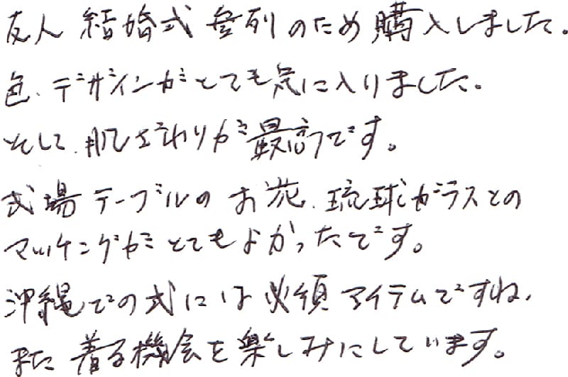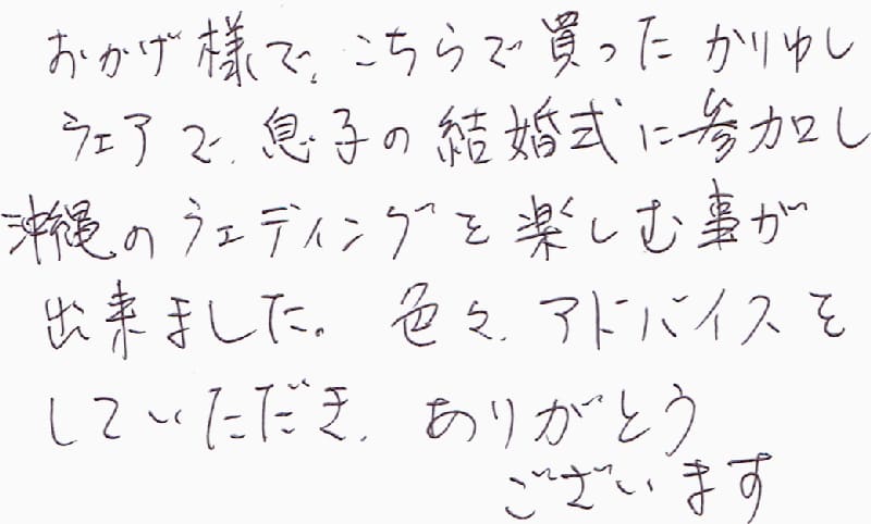 おかげ様で、こちらで買ったかりゆしウェアで、息子の結婚式に参加し沖縄のウェディングを楽しむ事が出来ました。色々、アドバイスをしていただき、ありがとうございます。