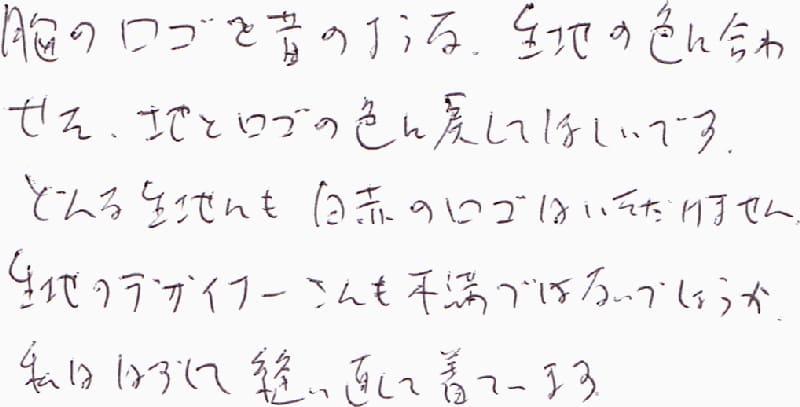胸のロゴを昔のような、生地の色に合わせた、地とロゴの色に戻してほしいです。どんな生地にも白赤のロゴはいただけません。生地のデザイナーさんも不満ではないでしょうか。私ははずして縫い直して着ています。