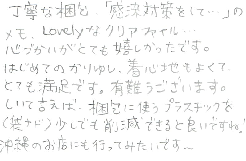 丁寧な梱包、「感染対策をして・・・」のメモ、Lovelyなクリアファイル・・・心づかいがとても嬉しかったです。はじめてのかりゆし、着心地もよくて、とても満足です。有難うございます。しいて言えば、梱包に使うプラスチックを(袋ナド)少しでも削減できると良いですね!沖縄のお店にも行ってみたいです~