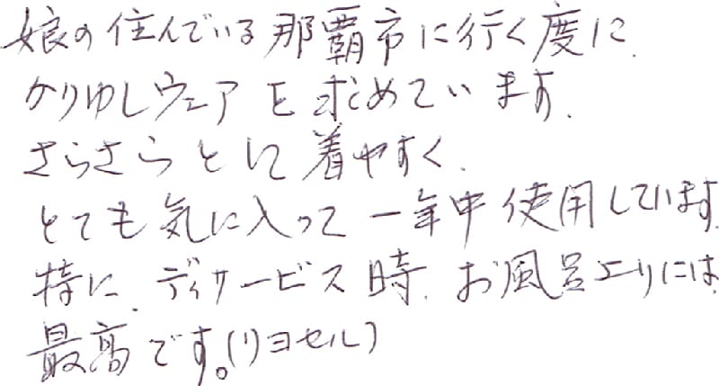 娘の住んでいる那覇市に行く度にかりゆしウェアを求めています。さらさらとして着やすく、とても気に入って一年中使用しています。特に、デイサービス時、お風呂上りには、最高です。(リヨセル)