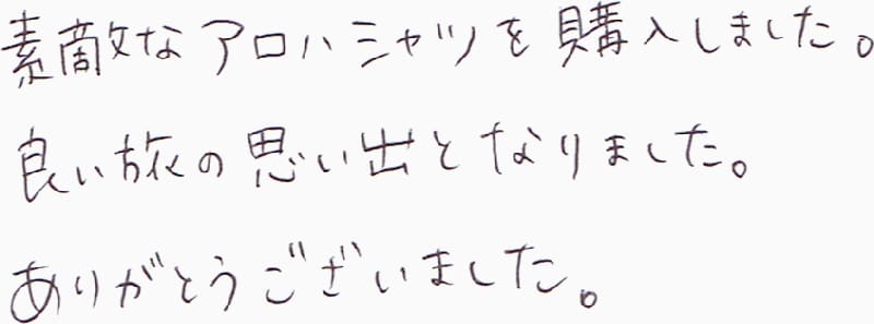 素敵なアロハシャツを購入しました。良い旅の思い出になりました。ありがとうございました。
