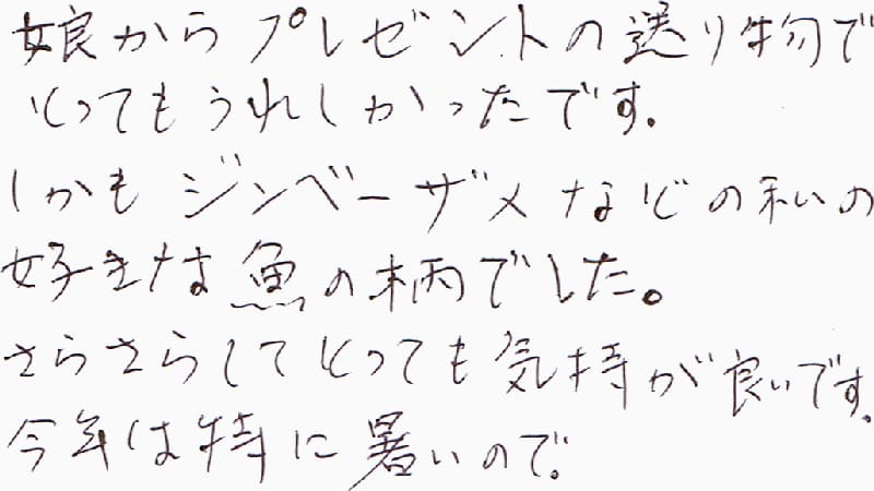 娘からプレゼントの送り物でとってもうれしかったです。しかもジンベ―ザメなどの私の好きな魚の柄でした。さらさらしてとっても気持ちが良いです。今年は特に暑いので。