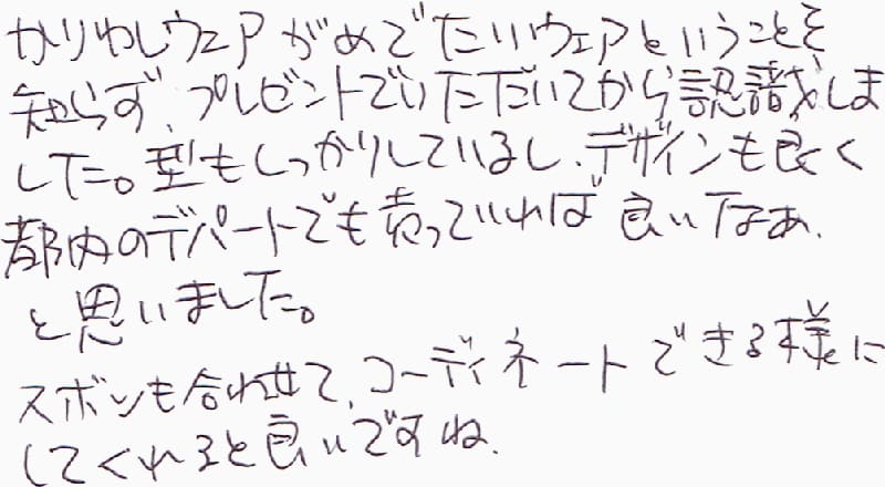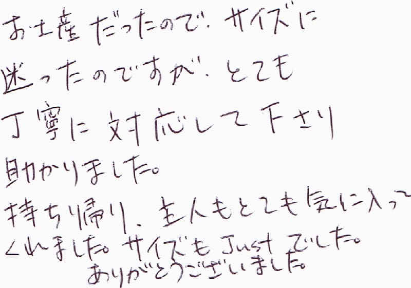 お土産だったので、サイズに迷ったのですが、とても丁寧に対応して下さり助かりました。持ち帰り、主人もとても気に入ってくれました。サイズもJustでした。ありがとうございました。