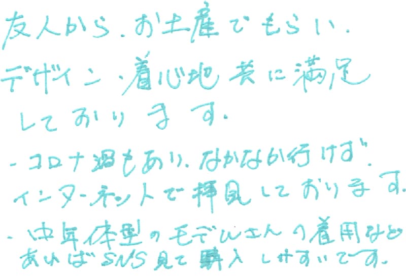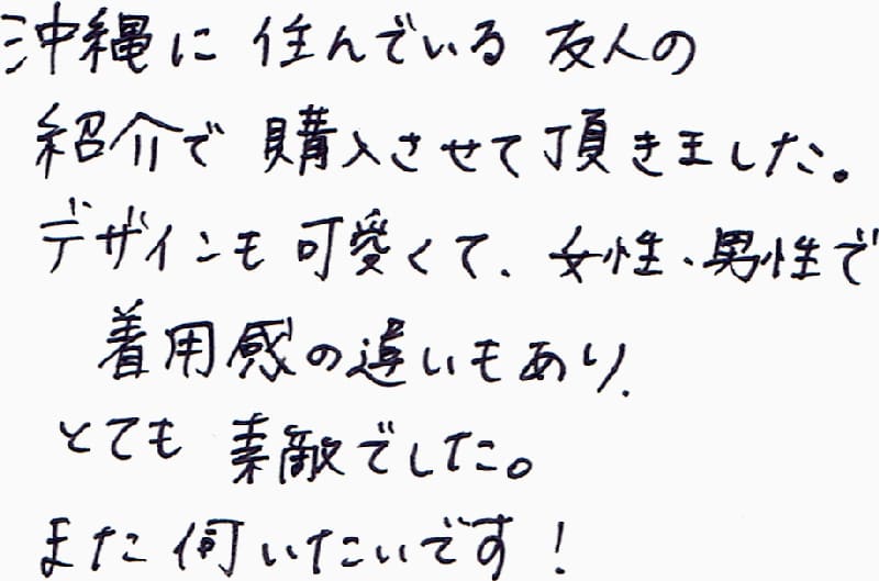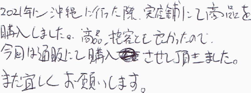 2021年に沖縄に行った際、実店舗にて商品を購入しました。商品、接客とも良かったので、今回は通販にて購入させて頂きました。また宜しくお願いします。