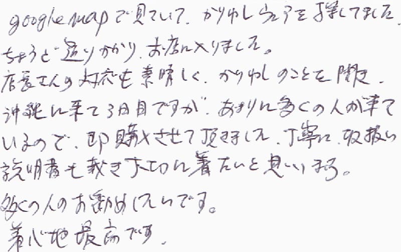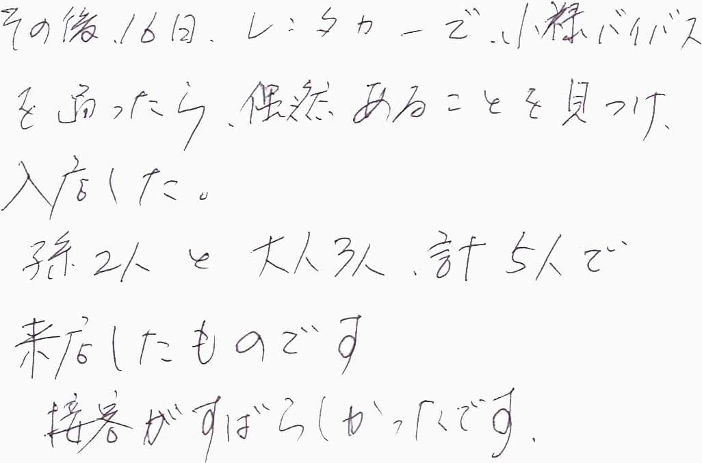 その後、16日、レンタカーで、小禄バイパスを通ったら、偶然あることを見つけ、入店した。孫2人と大人3人、計5人で来店したものです。接客がすばらしかったです。