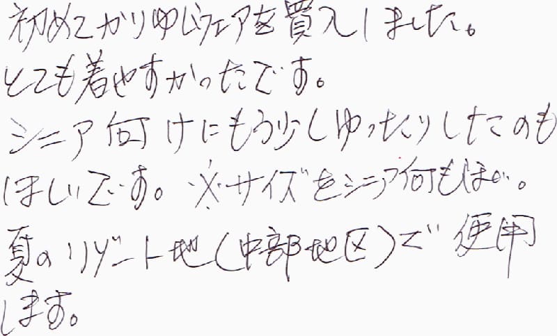 初めてかりゆしウェアを買入しました。とても着やすかったです。シニア向けにもう少しゆったりしたのもほしいです。※サイズをシニア何もほしい。夏のリゾート地(中部地区)で使用します。