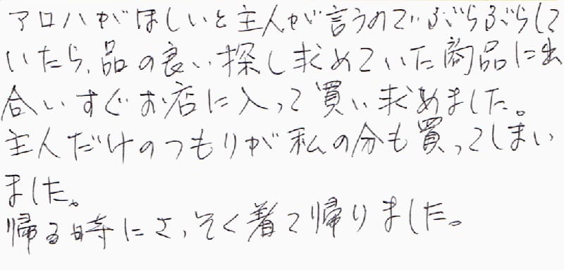アロハがほしいと主人が言うのでぶらぶらしていたら、品の良い探し求めていた商品に出合いすぐお店に入って買い求めました。主人だけのつもりが私の分も買ってしまいました。帰る時にさっそく着て帰りました。