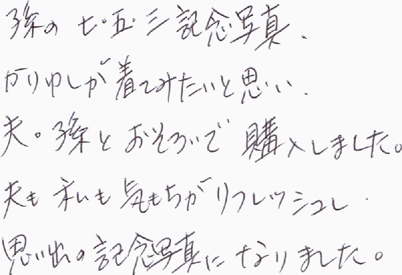 孫の七・五・三記念写真、かりゆしが着てみたいと思い、夫・孫とおそろいで購入しました。夫も私も気持ちがリフレッシュし、思い出の記念写真になりました。