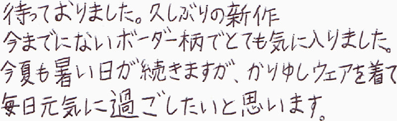 待っておりました。久しぶりの新作 今までにないボーダー柄でとても気に入りました。今夏も暑い日が続きますが、かりゆしウェアを着て毎日元気に過ごしたいと思います。