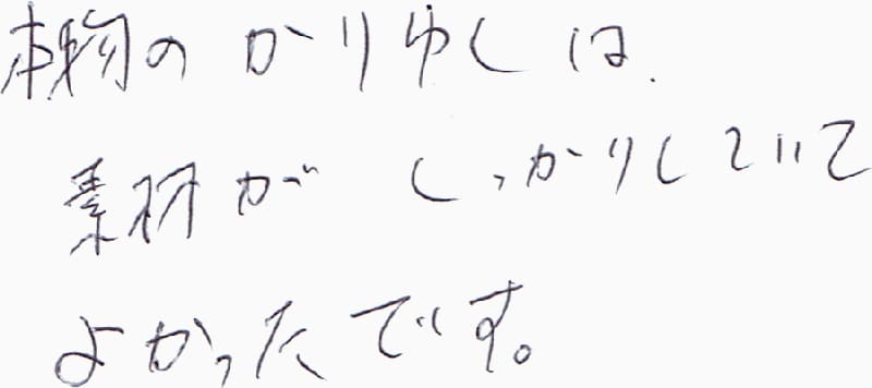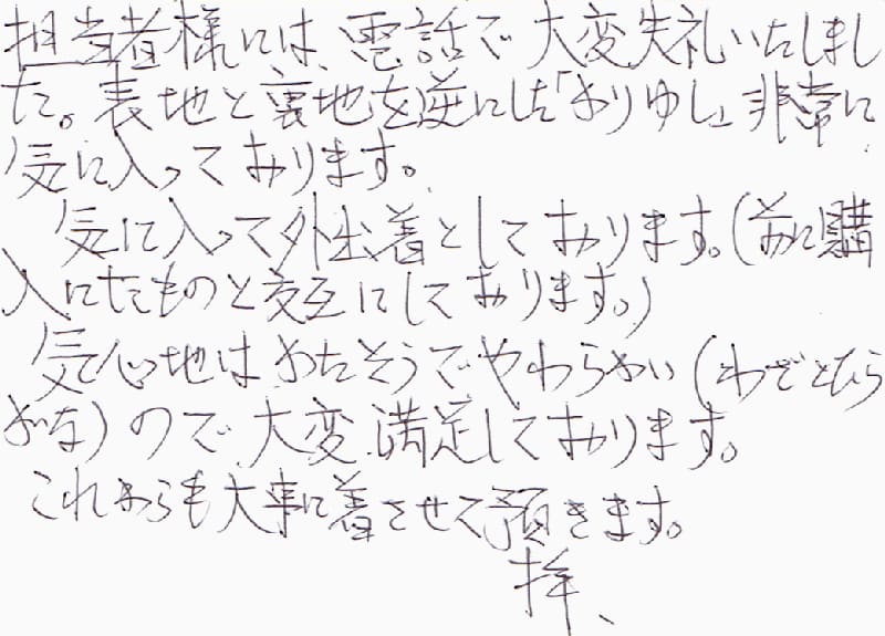 担当者様には、電話で大変失礼いたしました。表地と裏地を逆にした「かりゆし」非常に気に入っております。気に入って外出着としております。(前に購入してたものと交互にしております。)気心地は、かたそうでやわらかい(わざとひらがな)ので、大変満足しております。これからも大事に着させて頂きます。
