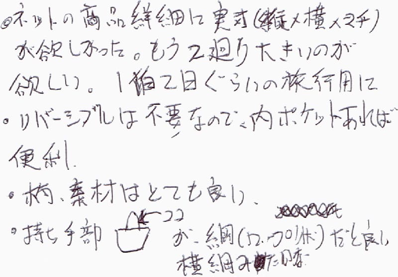 ネットの商品詳細に実寸(縦×横×マチ)が欲しかった。もう2廻り大きいのが欲しい。1泊2日ぐらいの旅行用に