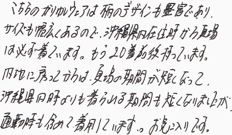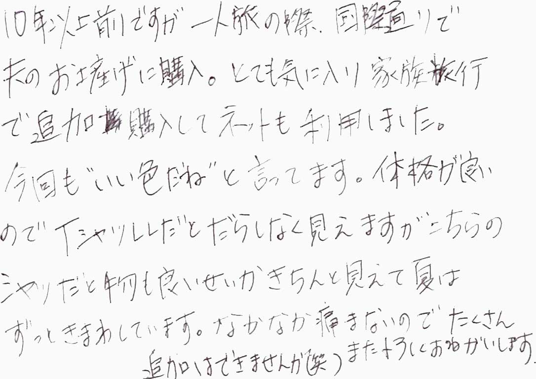 10年以上前ですが一人旅の際、国際通りで夫のお土産に購入。とても気に入り家族旅行で追加購入してネットも利用しました。今回も“いい色だね”と言っています。体格が良いのでTシャツLLだとだらしなく見えますがこちらのシャツだと物も良いせいかきちんと見えて夏はずっときまわしています。なかなか痛まないのでたくさん追加はできませんが(笑)またよろしくおねがいします。